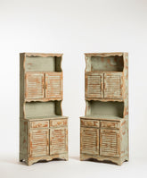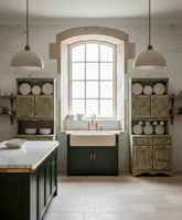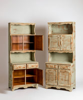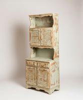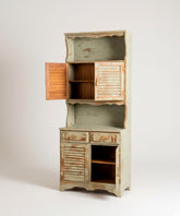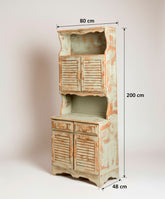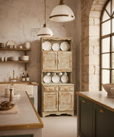 Esta alacena parece rescatada de una antigua masía de la Provenza, llevando consigo el alma y la calidez de la vida en el campo. Inspiradas en las tradicionales fresqueras, sus características puertas de lamas no solo son un bello detalle estético, sino que evocan cocinas luminosas y llenas de vida. Su estructura de madera maciza de roble está patinada en verde salvia, decapado para dejar que la veta y el tono natural de la madera respiren, creando una pátina que cuenta una historia. Ofrece una generosa capacidad de almacenaje, con estantes abiertos para lucir la vajilla y armarios para el resto.