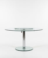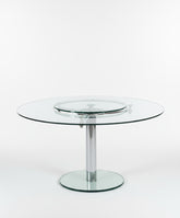 La tapa redonda de la mesa está fabricada en cristal transparente, lo que le confiere una sensación de ligereza y luminosidad.