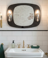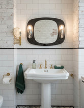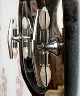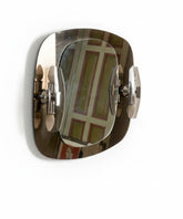 Hay objetos que son un viaje en el tiempo, y este espejo es un billete de ida y vuelta a la era más optimista y futurista del diseño. Original de los años 50, esta pieza es mucho más que un espejo: es una escultura lumínica. Su genial diseño se basa en un juego de superposiciones: un espejo central de contorno ovalado parece flotar sobre un panel más grande de elegante cristal ahumado con una silueta orgánica. Flanqueando el espejo, dos apliques de metal cromado y cristal ahumado proyectan una luz clara y favorecedora, completando una pieza que es tan funcional como espectacular. Es un testimonio de una época que soñaba con el futuro, perfecto para baños, tocadores o entradas con carácter.
