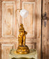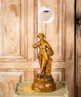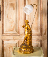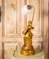 Esta original lámpara antigua es una pieza que combina la iluminación con la escultura, creando un elemento decorativo único y lleno de encanto. La figura de un cortesano sosteniendo una cesta, realizada en escayola con acabado dorado, sostiene una pantalla de cristal blanco, creando un conjunto que aportará un toque rústico y nostálgico a tu hogar.