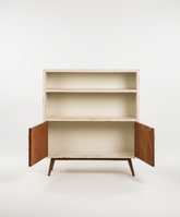 Este aparador, original de los años 60 es una pieza que destaca por su combinación de texturas y funcionalidades. Su estructura principal está acabada en un tono blanco roto o crema, que contrasta con las puertas inferiores de madera. La parte superior ofrece dos amplios estantes abiertos, ideales para exhibir libros o elementos decorativos. Un detalle distintivo y divertido son los tiradores de las puertas, que simulan ser unas piernas estilizadas, aportando un toque de creatividad y personalidad única. Con patas esbeltas y anguladas, este mueble es perfecto para un salón, un estudio o incluso un comedor, aportando un aire retro-contemporáneo y un almacenamiento versátil.