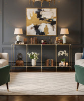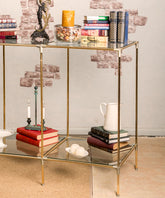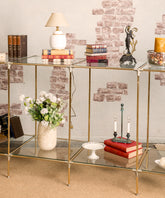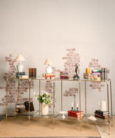 Exhibe tus colecciones más preciadas, vajillas finas o piezas de arte con la ligereza de este elegante expositor de tres cuerpos. Su estructura metálica, esbelta y de líneas depuradas, presenta un acabado de latón pulido que irradia calidez y un toque de glamour. El diseño se articula en cuatro secciones verticales, ofreciendo dos amplios niveles de estantes realizados en cristal transparente. Esta elección de material permite que la luz fluya libremente a través del mueble, resaltando los objetos expuestos desde todos los ángulos y evitando cualquier sensación de pesadez visual. Ideal para salones, comedores, bibliotecas o incluso espacios comerciales que buscan una pieza de mobiliario funcional y a la vez sumamente decorativa, capaz de aportar un toque de distinción atemporal con reminiscencias del estilo Hollywood Regency o Neoclásico.