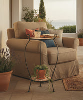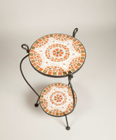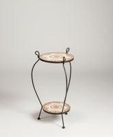 Este macetero de dos pisos es una pieza multifuncional. Con un diseño de forja y cerámica de mosaico, es el mueble auxiliar perfecto para tu terraza o salón. Aporta un toque mediterráneo y vibrante a tus plantas y bebidas.