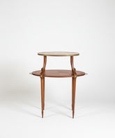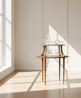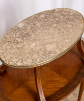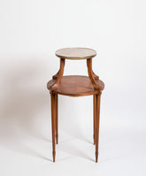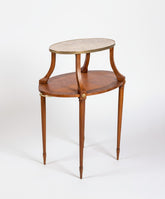 Esta mesa camarera antigua de estilo neoclásico se alza sobre cuatro finas patas ahusadas, uniendo dos bandejas ovaladas en una composición de perfecta armonía. La bandeja inferior es una delicada obra de ebanistería, con un minucioso trabajo de marquetería en maderas nobles que dibuja patrones geométricos. La superior, coronada por un exquisito sobre de mármol veteado, está protegida por una fina galería de latón. Sutiles apliques de bronce y pequeñas asas laterales añaden destellos de luz y completan una pieza de lujo discreto, ideal como mueble de servicio o como una sofisticada mesa auxiliar.
