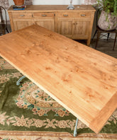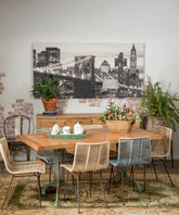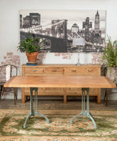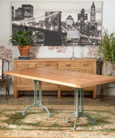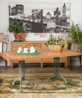 Esta mesa de comedor industrial es una pieza que aúna la robustez del hierro con la calidez de la madera natural. Su amplio tablero de madera clara, con una veta visible, descansa sobre dos patas de hierro forjado en un tono azul grisáceo o turquesa, con sutiles desgastes que revelan un pasado. Las patas, con un diseño que evoca la maquinaria antigua, aportan una base sólida y un carácter inigualable. Ideal para comedores de estilo loft, cocinas de concepto abierto o incluso como mesa de trabajo en un estudio creativo, esta mesa no es solo mobiliario, sino una declaración de diseño que celebra la funcionalidad y la historia de los materiales.