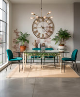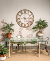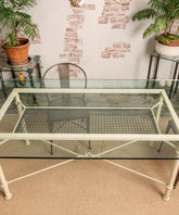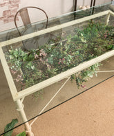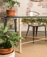 Esta singular mesa de forja, con su diseño que aúna la solidez del hierro forjado con la ligereza del cristal, es una pieza muy original. Su estructura de forja, en un suave tono crema o blanco roto con pátina, crea una base elegante y estable. La característica más distintiva es su doble tablero, una superficie superior de cristal para el uso diario y un nivel inferior de hierro que encierra un espacio expositor, ideal para crear un "jardín" interior con plantas, flores secas o colecciones, transformando la mesa en un terrario viviente o un escaparate personal. Ideal para salones y comedores que buscan un toque de originalidad y naturaleza en su interior, esta mesa es un testamento de diseño que fusiona lo funcional con lo artístico.