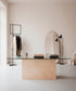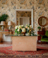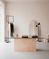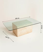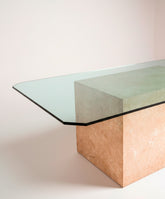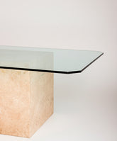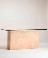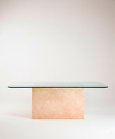 Esta mesa isla de mármol y cristal no es un simple mueble, es una declaración de intenciones; una pieza de arquitectura para el hogar que dialoga con la fuerza de la naturaleza y la pureza del diseño. Nacida de la corriente minimalista de los años 70, su presencia es a la vez monumental y etérea. Un rotundo pedestal de mármol, con su textura porosa y sus cálidos tonos tierra, ancla la pieza con una honestidad brutalista. Sobre él, y en un contraste sublime, un gran sobre de grueso cristal parece flotar, desafiando la gravedad y aportando una increíble sensación de ligereza y transparencia. Es una pieza para los amantes del diseño en mayúsculas, un objeto escultórico que transforma cualquier espacio en una galería de arte privada.