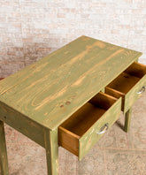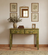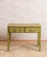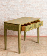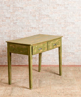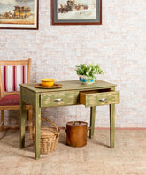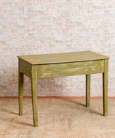 Esta mesa rústica antigua es una pieza que combina la funcionalidad con un estilo rústico y un toque de color. Su acabado en verde decapado le da un aspecto envejecido y original, ideal para cualquier espacio con aire rústico o vintage.