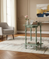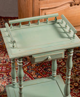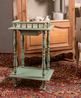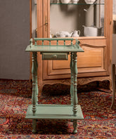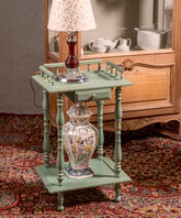 Añade un toque de encanto y funcionalidad a cualquier estancia con este velador o mesita alta. Pintada en verde suave, evoca la elegancia de estilos clásicos con un aire fresco y particular. Su característica más notable es la balda superior cuadrada, protegida en tres de sus lados por una barandilla formada por husillos torneados, ideal para colocar objetos decorativos, una pequeña lámpara o tus lecturas. Justo debajo de la superficie principal, un discreto cajón ofrece un práctico espacio para guardar pequeños tesoros o lo esencial. Un estante inferior adicional, unido a las cuatro patas torneadas añade más opciones de exposición. Perfecta como mesita de noche de aire romántico, como elegante mesa auxiliar en un salón o como un sofisticado pedestal para una planta o escultura.
