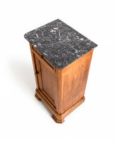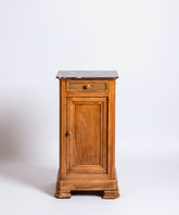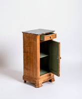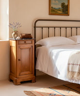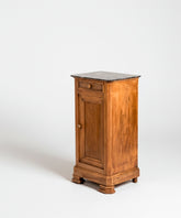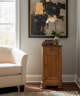 Esta mesita de noche antigua es la personificación de la elegancia y la calidad que dura. Inspirada en el sobrio y distinguido estilo Luis Felipe del siglo XIX, su diseño se centra en la belleza de sus materiales nobles. La estructura, de líneas puras y rotundas, está realizada en madera de nogal con una preciosa veta natural. Como contrapunto, un sobre de mármol negro con vetas blancas corona el mueble, aportando un toque de lujo y carácter. Funcional y compacta, ofrece un cajón superior y un armario que esconde una sorpresa: un interior lacado en un inesperado y profundo verde.