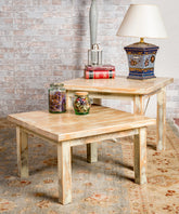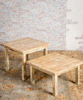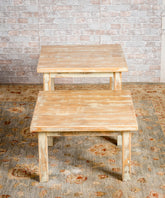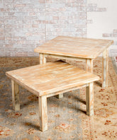 Este conjunto de dos mesas auxiliares de madera maciza destaca por su diseño sencillo y funcional, con un acabado decapado en un tono claro que le da un toque rústico y acogedor. Su forma cuadrada y su estructura robusta las hacen ideales para cualquier espacio, desde salas de estar hasta dormitorios o terrazas.