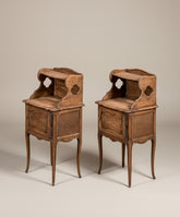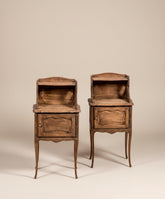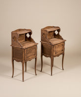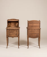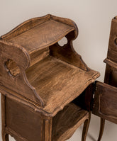 Esta pareja de mesitas de noche de roble es una auténtica joya con un diseño único. Su estructura de dos niveles y sus delicadas curvas le dan un aire de pieza antigua que combina el encanto de lo rústico con un práctico almacenaje para tu dormitorio.