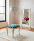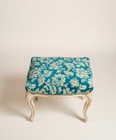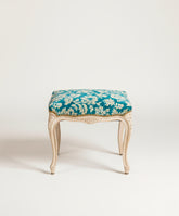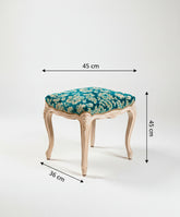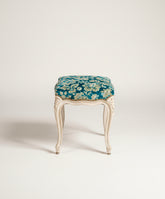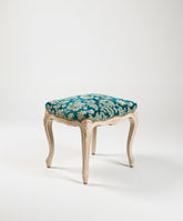 Esta pequeña banqueta es un capricho, una de esas piezas joya que tienen el poder de elevar la sofisticación de cualquier estancia. Su silueta, de pura inspiración Rococó Luis XV, fluye en sus patas cabriolé y en las suaves curvas de su faldón tallado a mano. La estructura de madera, acabada en un suave tono blanco roto con una sutil pátina, sirve de marco perfecto para el verdadero protagonista: un tapizado en terciopelo adamascado. Sobre un fondo de un intenso y profundo azul petróleo, un elegante dibujo floral en tonos plata y beige crea un contraste de una riqueza visual espectacular. Es el acento de lujo perfecto para un dormitorio, un vestidor o un rincón del salón.