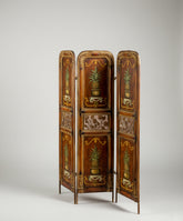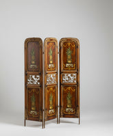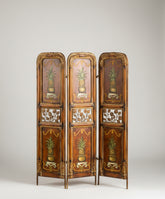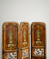 Detalles: Tres paneles articulados con ilustraciones de piñas y motivos florales. Acabado de pintura con efecto envejecido y toques dorados.