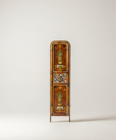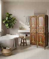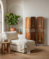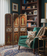 Este elegante biombo de metal pintado a mano combina la delicadeza del arte colonial con la elegancia del estilo neoclásico. Sus paneles, decorados con piñas —símbolo de hospitalidad y prosperidad—, transforman cualquier rincón en un espacio con alma.