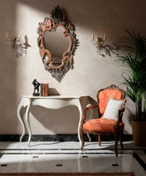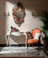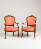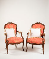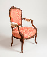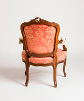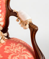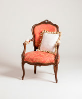 Esta butaca es una celebración del esplendor y la gracia del estilo Luis XV, una joya de la ebanistería francesa destinadas a presidir un salón con majestuosidad. Su estructura de madera de nogal, tallada a mano, fluye en un festival de curvas, desde la cresta del respaldo hasta sus elegantes patas cabriolé. Para vestirlas, se ha escogido un damasco de seda en cálidos tonos coral y oro, cuyo dibujo floral aporta luz y una riqueza visual extraordinaria. Como detalle de refinamiento, los brazos se adornan con delicados manguitos protectores rematados con borlas. Son mucho más que asientos: son piezas de conversación, esculturas funcionales que traen el lujo de la corte francesa a tu hogar.