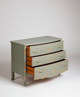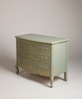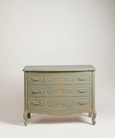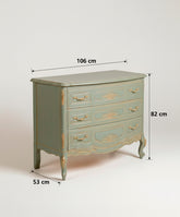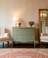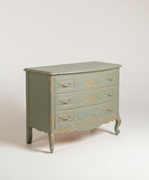 Esta cómoda antigua es pura poesía Rococó, una pieza que celebra la curva, el ornamento y la elegancia más exquisita. Inspirada en el estilo Luis XV, toda su silueta es un juego de líneas sinuosas, desde su característico frente hasta sus gráciles patas cabriolé. Su estructura de madera ha sido vestida con un acabado en verde salvia, un color que le aporta un toque de frescura y distinción. Sobre este fondo, todas las exuberantes tallas de rocalla, los perfiles de los cajones y los tiradores de bronce florecen con una delicada pátina dorada, creando un contraste lujoso y armónico. Es una pieza majestuosa, destinada a ser la protagonista de un dormitorio o salón con clase.