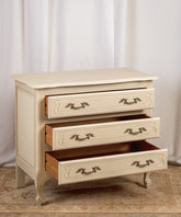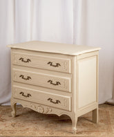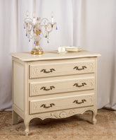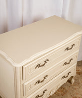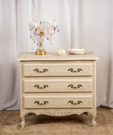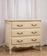 Esta encantadora cómoda, con su inconfundible estilo francés provincial, es una pieza que evoca la gracia y la sofisticación de la campiña gala. Su acabado en un suave tono beige realza los detalles ornamentales que la caracterizan.