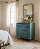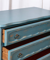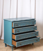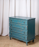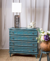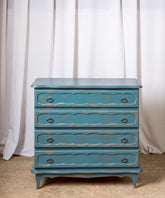 Esta cómoda es una pieza que irradia frescura y un inconfundible encanto vintage, con un toque provenzal. Cuidadosamente restaurada, luce un acabado decapé en un hermoso tono azul turquesa, donde sutiles desgastes revelan la madera original, aportando una pátina auténtica y atractiva. Sus cuatro amplios cajones con tiradores de argolla metálicos, ofrecen un generoso espacio de almacenamiento. Las líneas suaves y la base delicadamente moldeada, evocan la ligereza del mobiliario de antaño. Ideal para un dormitorio, un recibidor o incluso un salón, esta cómoda no solo es funcional, sino que infunde una atmósfera de alegría y un estilo único a cualquier estancia.
