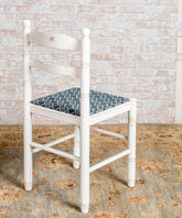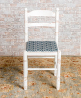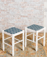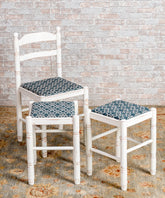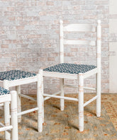 Este encantador conjunto de silla y taburetes vintage es perfecto para añadir un toque de estilo rústico y funcionalidad a tu hogar. Su diseño clásico con un acabado decapado en blanco y tapicería estampada en tonos azules les confiere un aire acogedor y atemporal.