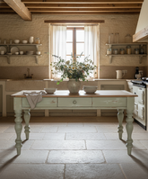 Descubre nuestra mesa de comedor antigua fabricada en madera maciza con patas torneadas en verde salvia desgastado y sobre natural. Ideal para cocinas con encanto.