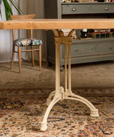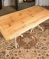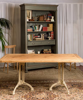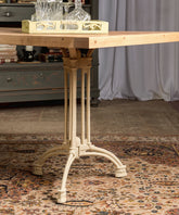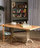 Esta no es solo una mesa industrial, es el punto de encuentro entre dos mundos: la calidez de la madera artesana y la fuerza del pasado industrial. Su sobre, construido con tablones de madera de pino maciza, muestra sus nudos y vetas, y con un acabado natural que invita al tacto. El sobre descansa sobre dos patas de hierro fundido, recuperadas de antiguas maquinarias, cuya pátina y diseño robusto cuentan una historia de trabajo y durabilidad. La combinación de la madera clara y el hierro en su acabado original color beige crea un equilibrio perfecto entre lo rústico y lo sofisticado.
