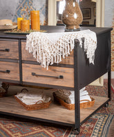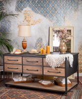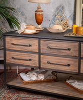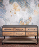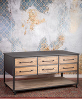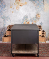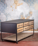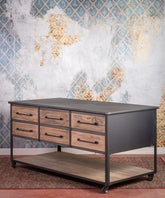 - Esta mesa isla industrial de madera y metal cuenta con seis cajones para un amplio almacenamiento.