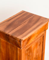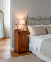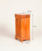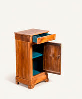 Esta mesita antigua de noche es un maravilloso ejemplo de la elegancia sobria y atemporal del estilo Luis Felipe: una estructura de líneas puras realizada en madera de nogal, con una cálida pátina que solo el tiempo puede otorgar. Es una pieza que transmite calma, solidez y la belleza de la ebanistería clásica. Pero esta mesita guarda un secreto. Al abrir su cajón o su puerta, se revela un inesperado y vibrante interior en azul petróleo, un audaz contrapunto contemporáneo que dialoga con la tradición. Es la pieza perfecta para quienes aman los clásicos pero buscan un guiño de personalidad y diseño que la haga absolutamente única.