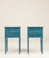 La sofisticación se viste de azul. Elevadas sobre una silueta esbelta de inspiración Luis XVI, esta pareja de mesitas de noche representa la unión perfecta entre el patrimonio clásico y la audacia del diseño interior moderno. Su profundo tono azul petróleo, trabajado con una técnica de envejecido manual, aporta una profundidad visual que las convierte en las protagonistas indiscutibles del dormitorio.