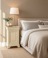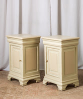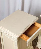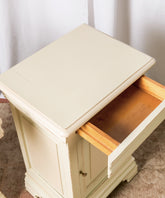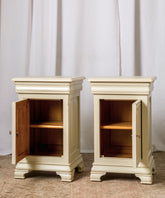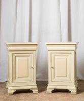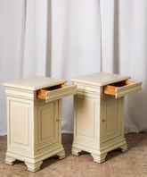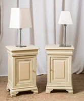 Descubre la elegancia de esta pareja de mesitas de noche, piezas que irradian un encanto clásico y atemporal. Cuidadosamente restauradas, lucen un acabado en un suave tono beige o crema, con una ligera pátina que realza sus molduras y sus líneas limpias. Cada mesita combina un cajón superior oculto y una puerta inferior que revela un espacio de almacenamiento discreto, ideal para mantener el orden en el dormitorio o en un rincón especial. Su diseño rectangular y sus patas sólidas con molduras evocan la solidez y la belleza del mobiliario tradicional. Son el complemento perfecto para un dormitorio que busca funcionalidad sin renunciar al estilo y a la atmósfera acogedora.