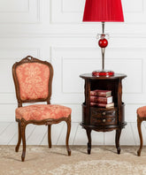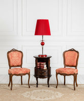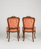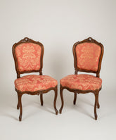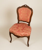 La elegancia reside en la armonía, y estas sillas antiguas es la personificación de la gracia y el equilibrio. Cada silla es una joya de la ebanistería del siglo XIX, con una estructura de nogal macizo tallada a mano que dibuja en el aire las curvas y contracurvas propias del estilo. Su respaldo en forma de medallón, coronado por un copete, y sus patas cabriolé son un testimonio de su nobleza. Para vestirlas, se ha seleccionado un damasco en tonos coral y oro, un tejido rico en matices que aporta calidez y distinción.