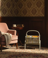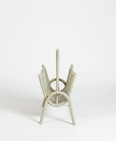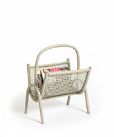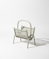 Los pequeños detalles son los que otorgan alma a un espacio, y este revistero vintage es una de esas piezas con un carácter inmenso. Su diseño, una clara oda a la elegancia funcional del Mid-Century francés, se basa en una ligera estructura de madera curvada que dibuja una silueta continua desde las patas hasta su cómoda asa superior. Los dos paneles que acogen las revistas están realizados con un patrón de rejilla de mimbre, un detalle que le confiere una gran ligereza visual y un atractivo juego de texturas. Todo el conjunto está patinado en un color verde grisáceo,