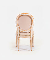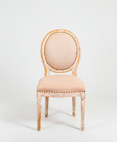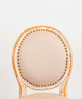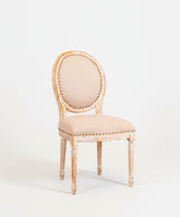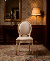 Esta silla de estilo Luis XVI es un icono del refinamiento francés reinterpretado con una cálida y luminosa alma provenzal. Su estructura sigue la inconfundible y elegante silueta del estilo Luis XVI, con su característico respaldo ovalado en forma de medallón y sus patas rectas y estriadas, símbolos de la elegancia neoclásica. Presenta un acabado decapé, donde una capa de pintura en blanco roto ha sido desgastada para dejar entrever la cálida madera de su interior, creando una pátina llena de carácter. El asiento y el respaldo, tapizados en lino natural y rematados con tachuelas de latón, completan una pieza que fusiona a la perfección la elegancia palaciega con la calidez del campo.