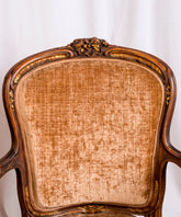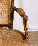 Este sillón antiguo es mucho más que un asiento; es una obra de arte que encarna todo el esplendor y la gracia del estilo Luis XV. Su estructura, una sinfonía de curvas y contracurvas esculpida en madera de nogal, fluye con una naturalidad que desafía la rigidez de la materia. Exuberantes tallas de motivos florales y rocalla, realzadas con sutiles toques dorados, coronan el respaldo y adornan el faldón y las patas cabriolé. Para acentuar su vocación de confort y lujo, se ha vestido con un cálido terciopelo en tono ocre, cuya textura invita al tacto y al descanso. Sentarse en él es transportarse a un salón del siglo XVIII, una pieza que irradia historia, arte y un inconfundible aire de nobleza.