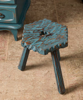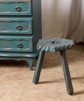 Este singular taburete rústico es una pieza que emana autenticidad y el encanto de lo hecho a mano. Su superficie y patas, talladas con la irregularidad propia de la madera natural, están acabadas en un tono azul turquesa con un efecto decapé que revela las capas inferiores y la textura original de la madera. Esta pátina le confiere un carácter vivido y una estética bohemia. Ideal como asiento auxiliar en un rincón informal, como soporte para una planta o como elemento decorativo en un baño o jardín interior, este taburete es una invitación a la imperfección hermosa y a la historia que el mobiliario antiguo susurra.