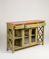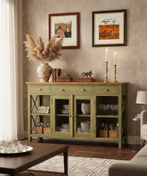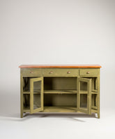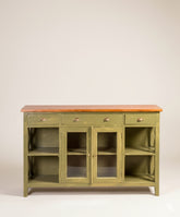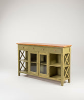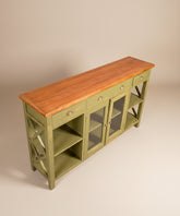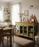 Este amplio aparador de madera es la solución perfecta para tu hogar. Su diseño rústico farmhouse, con sobre natural y acabado verde, ofrece gran almacenaje para tu cocina o salón, combinando estilo y funcionalidad de forma impecable.