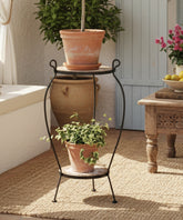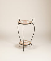 Este macetero de dos pisos es una pieza multifuncional. Con un diseño de forja y cerámica de mosaico, es el mueble auxiliar perfecto para tu terraza o salón. Aporta un toque mediterráneo y vibrante a tus plantas y bebidas.