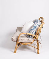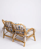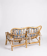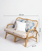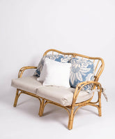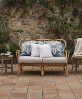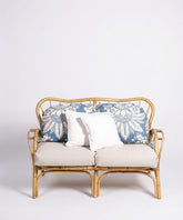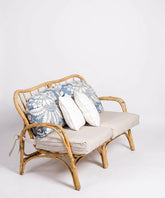 Aporta calidez y estilo con este sofá de ratán natural de 2 plazas. Incluye cojines florales azules. Ideal para salones y terrazas cubiertas.