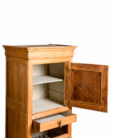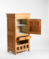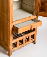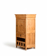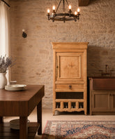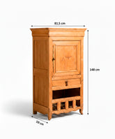 Hay muebles que son el corazón de una casa, y esta antigua alacena de estilo provenzal tiene esa cualidad cálida y acogedora. Realizada en madera maciza de roble, ha sido recuperada a través de un proceso de decapado que ha desvelado la veta y el tono natural de la madera, antes ocultos bajo un barniz oscuro. Este acabado "lavado" le confiere una luminosidad y una textura llenas de autenticidad. Su diseño es tan práctico como encantador: un armario superior para guardar la vajilla, un cajón central para los cubiertos o manteles, y un original botellero en la parte inferior. Es una pieza única, llena de historia, perfecta para aportar carácter y almacenaje a una cocina o un comedor.