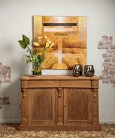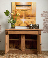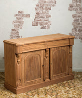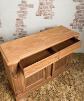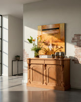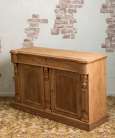 This 1950s sideboard, with its distinct neoclassical style, radiates the sobriety and proportion of its era. It features two upper drawers and two wide lower doors with panels and carvings on the pilasters flanking the center, adding a touch of distinction and craftsmanship. Its clean lines and solid base make it a versatile piece of storage for any room. Ideal for a dining room, hallway, or living room, this sideboard is not only functional but also exudes an air of history and timeless elegance.
