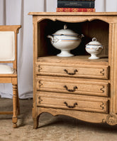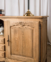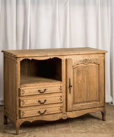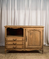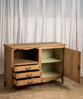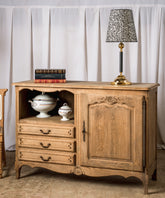 This charming antique French Provençal sideboard exudes authenticity and functionality. Made of oak wood with a natural finish that enhances its grain, this piece stands out for its combination of spaces: an open niche with a shelf and three lower drawers, complemented by a side door with a carved panel. The wrought iron hardware and curved moldings evoke the simplicity and charm of French country houses. It's a versatile piece, ideal for the dining room, the kitchen, or even as a side piece in a living room, adding warmth and a touch of history.