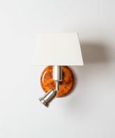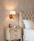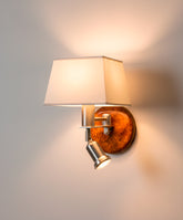 Inspirado en la iluminación de las suites de los más lujosos hoteles, este aplique de pared es la solución definitiva para el cabecero de la cama. Su diseño combina de forma magistral la calidez de los materiales clásicos con una funcionalidad rabiosamente moderna. La pieza se ancla a la pared con una preciosa base circular de latón con terminación que imita la madera de raíz, de veta rica y acabado brillante. Sobre ella, una estructura de metal en níquel satinado sostiene una doble fuente de luz: una luz principal, tamizada por una elegante pantalla de tela para crear ambiente, y un práctico foco orientable, para una lectura cómoda que no moleste. Es la fusión perfecta entre la lámpara de ambiente y la lámpara de lectura