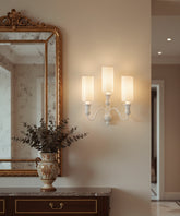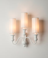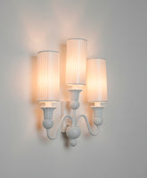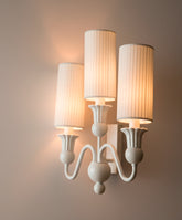 Este aplique de pared es una pieza que reinterpreta la silueta de un candelabro clásico con una visión totalmente contemporánea. Su diseño de tres brazos, de líneas suaves y fluidas, está realizado en metal y acabado en blanco roto mate. Este tratamiento monocromático le confiere una presencia escultural y una gran cohesión visual. Cada uno de los puntos de luz está coronado por una alta y esbelta pantalla cilíndrica de tela plisada, un detalle que aporta una exquisita textura y que, al encenderse, difumina la luz creando una luminiscencia cálida, vertical y muy acogedora. Es el toque de luz perfecto para un salón, pasillo o dormitorio que busque una sofisticación serena.