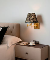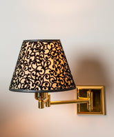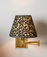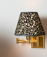 Este aplique de pared es la definición de la elegancia funcional. Su diseño, de una modernidad atemporal, presenta una estructura de líneas puras con un práctico brazo articulado de latón pulido, ideal para orientar la luz con total precisión. Sin embargo, su verdadera personalidad reside en su pantalla: sobre un fondo cálido, se dibuja un patrón de volutas barrocas en relieve de terciopelo negro. Al encenderse, el dibujo cobra vida, creando una atmósfera íntima, cálida y llena de matices. Es una pieza que combina la funcionalidad de una lámpara de lectura de alta gama con el impacto decorativo de un objeto de lujo, perfecta para el cabecero de la cama.