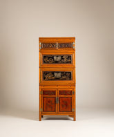 Descubre este antiguo armario de boda chino apilable del s. XIX. Una pieza única en madera tallada y lacada, ideal para dar un toque exótico a tu decoración.