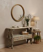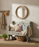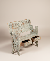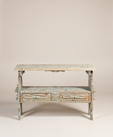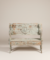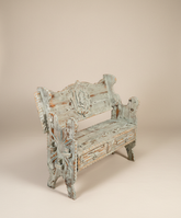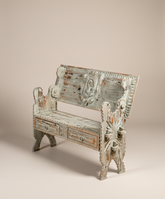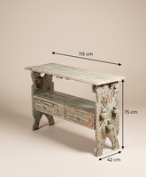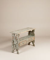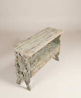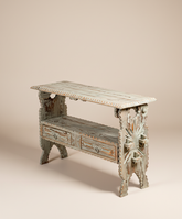 Banco o consola de madera maciza con tallas artesanales y acabado decapado en verde grisáceo. Pieza única de inspiración alpina y estilo provenzal, perfecta para entradas o dormitorios con encanto rústico y alma vintage.