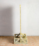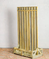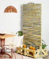 This reclaimed wood screen, patinated in yellow and green tones, is a unique piece full of character that will add a touch of style and functionality to any space.
