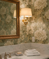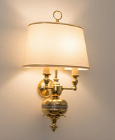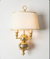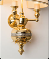 Este aplique de pared es una declaración de elegancia atemporal y calidad superior. Inspirado en la majestuosidad sobria del estilo Imperio, está íntegramente realizado en latón, lo que le confiere una presencia y una solidez extraordinarias. Su diseño se articula en torno a un cuerpo central en forma de urna, del que nacen dos brazos de candelabro. El detalle que lo eleva a la categoría de pieza de orfebrería es la exquisita franja de metal plateado, finamente cincelada con motivos de laurel, que abraza el cuerpo central. Las dos luces quedan unificadas bajo una única y elegante pantalla de media luna, que proyecta una luz cálida, noble y envolvente, ideal para espacios distinguidos.