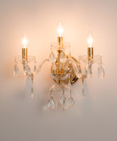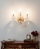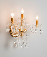 Hay piezas de iluminación que van más allá de su función para convertirse en auténticas joyas murales. Este magnífico aplique de tres brazos es un claro ejemplo. Su majestuoso diseño, de inspiración palaciega, nace de una base de latón pulido de la que emergen tres elegantes brazos de cristal moldeado. Toda la estructura está generosamente vestida con una cascada de caireles de cristal de Swarovski de alta calidad, facetados con maestría para capturar y multiplicar la luz en un sinfín de destellos. Encendido, se convierte en un espectáculo luminoso que inunda la estancia de una atmósfera cálida, suntuosa e innegablemente glamurosa, digna de los salones más distinguidos.