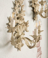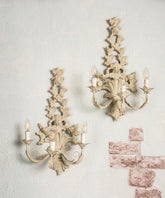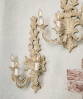 Esta pareja de apliques antiguos de pared, con su diseño que evoca la exuberancia y la gracia del estilo barroco, son piezas que infundirán un aire de romanticismo y distinción a cualquier pared. Elaborados en madera y metal con un acabado patinado en un suave tono beige, presentan intrincados detalles de hojas y volutas que se entrelazan de manera vertical, creando una sensación de movimiento. Cada aplique sostiene tres puntos de luz tipo candelabro, aportando una iluminación cálida y ambiental, ideal para crear una atmósfera íntima. Perfectos para flanquear un espejo, una obra de arte o para dar la bienvenida en un recibidor, estos apliques no solo iluminan, sino que se convierten en elementos decorativos esculturales.